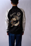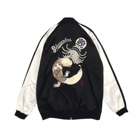 井上氏の代名詞とも言えるサンショウウオ(サラマンダー)をスカジャンのマナーに落とし込んだサテン素材のスカジャン。