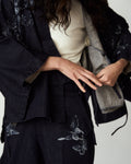 セットでタックインして着た時に一見お着物に見えるようなデザインなので、パンツのウエストの部分には帯締めのデザインも施して。