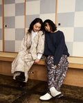 套装为作务衣与高腰裤,不仅可以单独穿着,也可以套装穿着。套装穿着时,作务衣可以合上,将前后开衩部分塞入裤子中,外观看起来就像穿了和服。